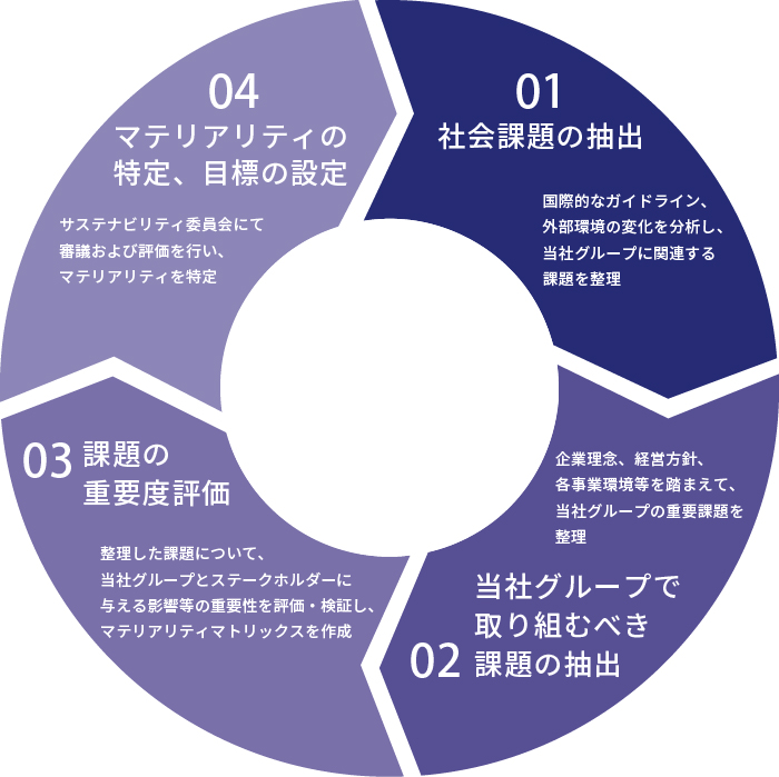 当社グループは、事業活動と社会・環境への影響を踏まえ、適切なマテリアリティを特定するためのプロセスを策定しています。
